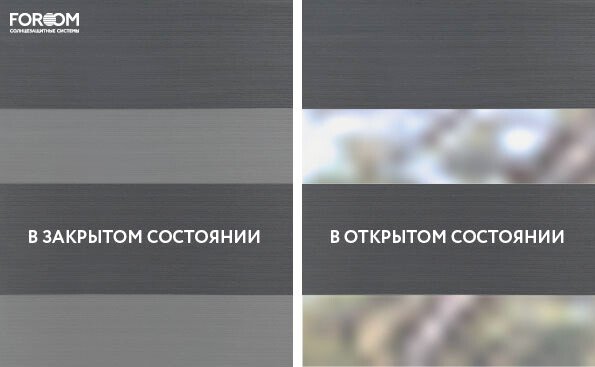 Каждый слой ткани имеет чередующиеся непрозрачные и прозрачные полосы. При смещении полос друг относительно друга можно добиться полного затемнения («ночь», когда непрозрачные полосы совпадают), максимального светопропускания («день», когда совпадают прозрачные полосы) или промежуточных режимов, создавая эффект «зебра».