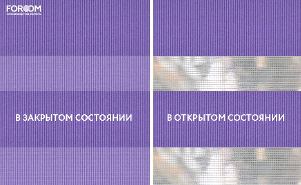 Полотно ткани, состоит из чередующихся горизонтальных полос – прозрачных и непрозрачных. Изменяя положение этих полос относительно друг другу, можно создать целых 3 режима регулировки светом. Например, чтобы в помещении стало светлее, нужно расположить прозрачные полосы друг напротив друга. Если разместить прозрачную и непрозрачную полосу параллельно друг другу, то можно добиться практически полного затемнения.